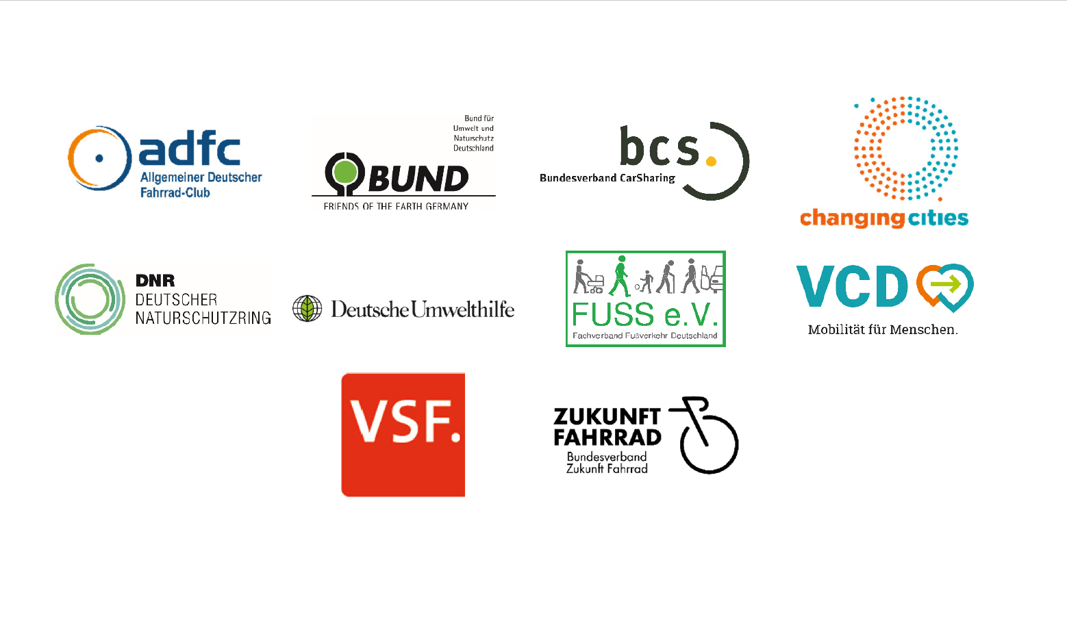 Unterzeichnet haben den offenen Brief folgende Verbände und Organisationen: Allgemeiner Deutscher Fahrrad-Club (ADFC), Bund für Umwelt- und Naturschutz Deutschland (BUND), Bundesverband CarSharing (BCS), ChangingCities, Deutscher Naturschutzring (DNR), Deutsche Umwelthilfe (DUH), Fachverband Fußverkehr Deutschland (FUSS e.V.), Verkehrsclub Deutschland (VCD), Verbund Service und Fahrrad (VSF), Bundesverband Zukunft Fahrrad.